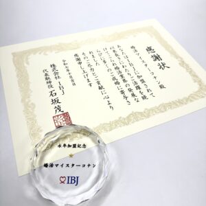 このたび、当社はIBJ(日本結婚相談所連盟)様より「永年加盟記念」として、感謝状と記念品を頂戴いたしました。これは、長年にわたり真摯に婚活支援に取り組んできた証として頂いたものであり、スタッフ一同、心より光栄に感じております。