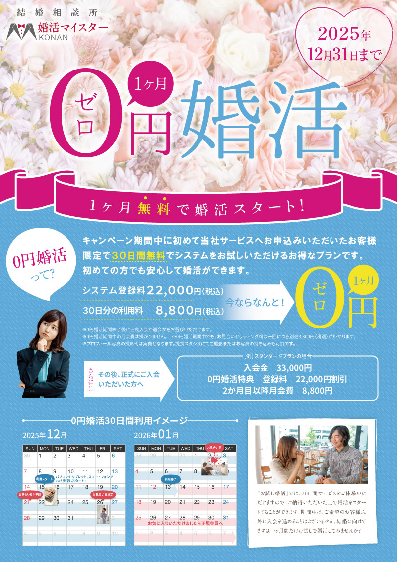 1カ月無料で婚活スタート!0円婚活【12月31日まで】
