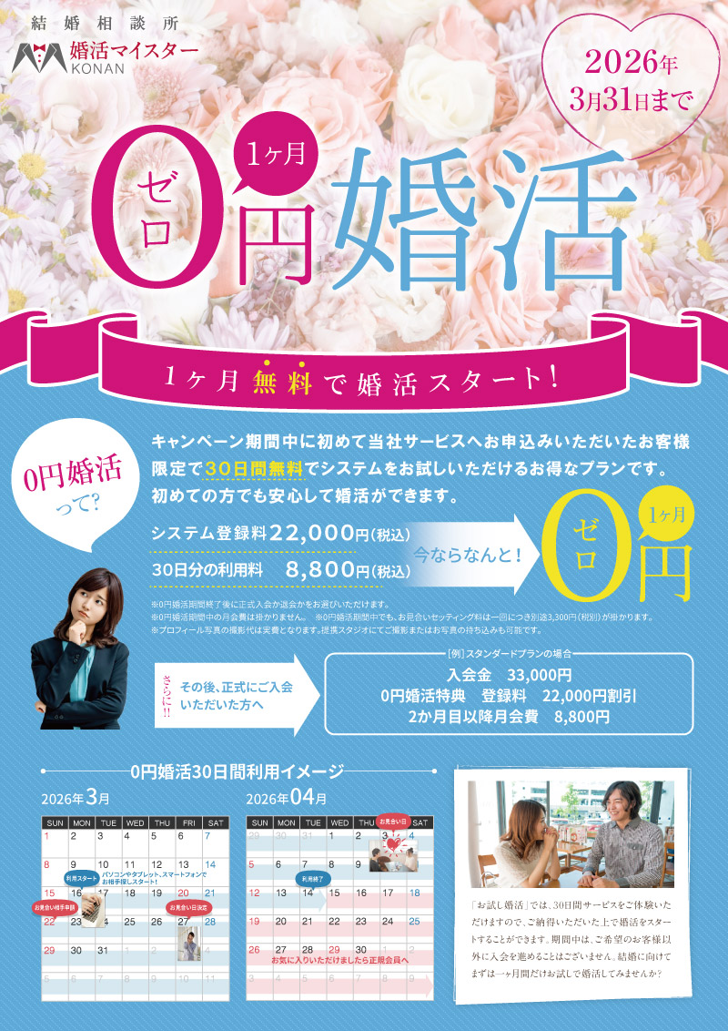 1カ月無料で婚活スタート!0円婚活【3月31日まで】